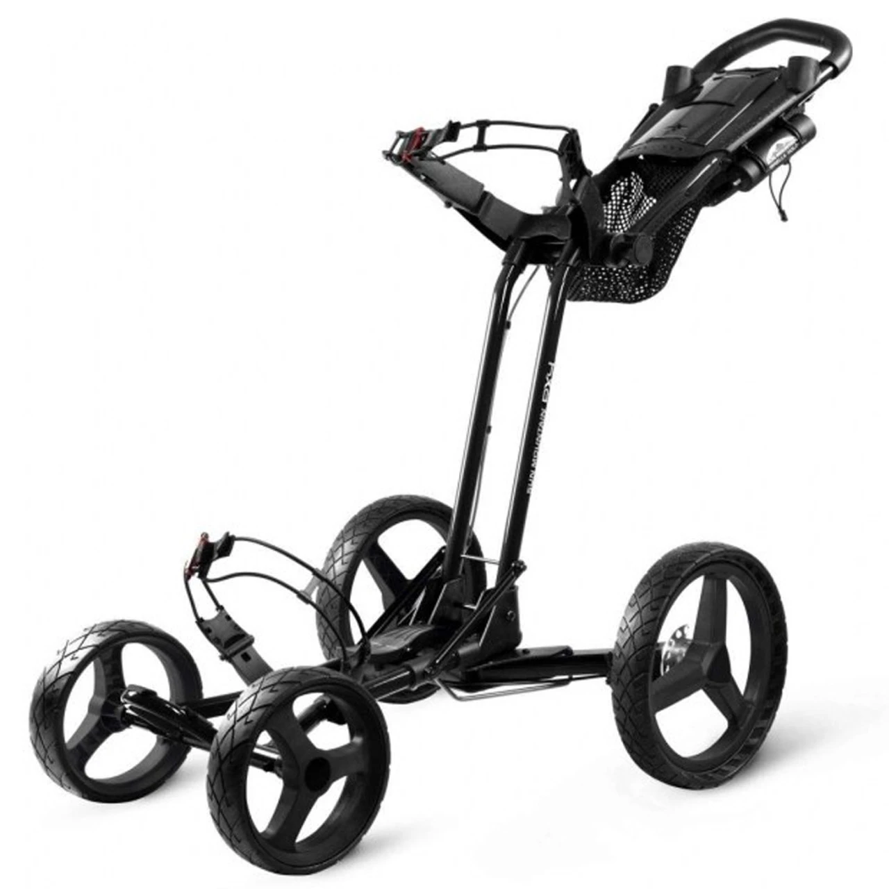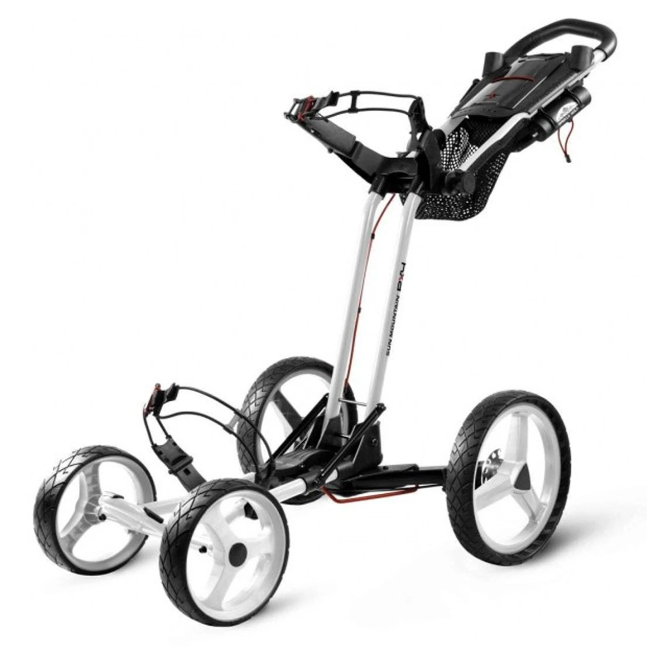 The Sun Mountain Pathfinder PX4 Push Cart is an update of the Pathfinder 4, that has has many of the same winning features, plus several updates. Like the Pathfinder 4, the PX4 folds/unfolds in two easy steps and has built-in storage. The new single-piece handle allows the cart to be pushed with one hand and the updated console tray has dual-umbrella attachments. The two front wheels extend to accommodate larger bags (a 5mm Allen wrench can make this adjustment). This cart includes a drink holder.