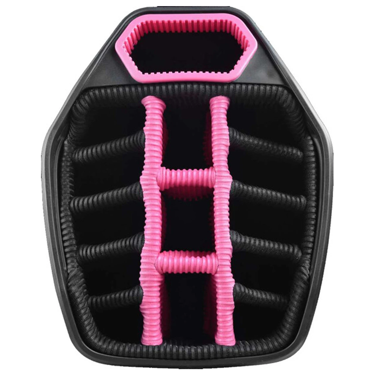 - The cart strap pass-through, which runs behind the rangefinder pocket and the two side pockets, allows the bag to be secured to the cart without hindering pocket access.